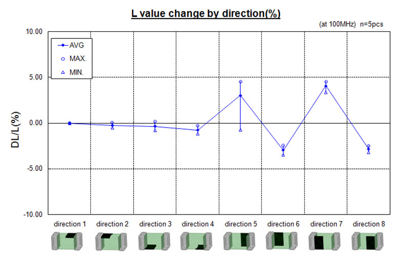 电感中往往附有可辨别方向性的印记(标记)。 我公司商品--薄膜型LQP_T系列产品/多层型LQG系列产品/一部分绕线型LQH产品中附有上述标记。若电感的构造不完全对称,则封装方向上将产生特性差异。因此,为使产品在使用过程中充分发挥其应有的特性,产品上往往标有标记,以表明其方向性。 图1是封装方向不同将导致电感值发生变化的实例。