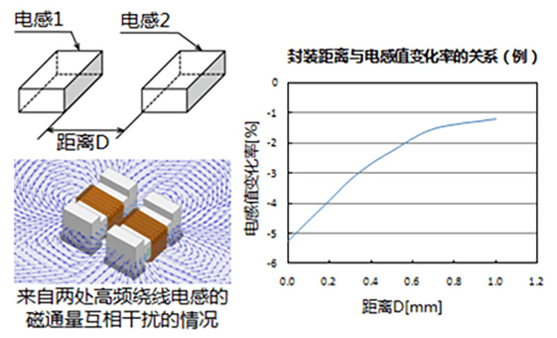 电感会产生磁通量。该磁通量向外部辐射(我公司开发出了一系列防止磁通量向外辐射的产品),这部分能量就损失了。若将多个电感紧密封装在一起,各电感向外部辐射的磁通量将会互相干扰,无法达到所期望的产品特性。 外部磁通量能左右电感特性,从而可能进一步影响周边元器件。选择使用的元器件时,请充分考虑上述影响因素并选择最合适的布局。