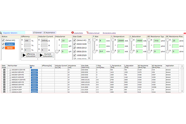 只要使用村田的设计辅助软件“SimSurfing/DC-DC转换器设计辅助工具”,即可根据所要求的技术规格搜索上佳产品。如图1-6的红框所示,在搜索项目中输入电感、尺寸、Itemp、Isat的要求值后,即在蓝框部分列表显示符合条件的产品。