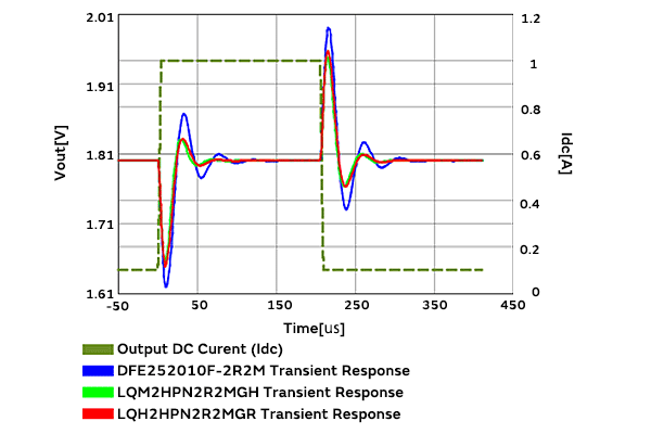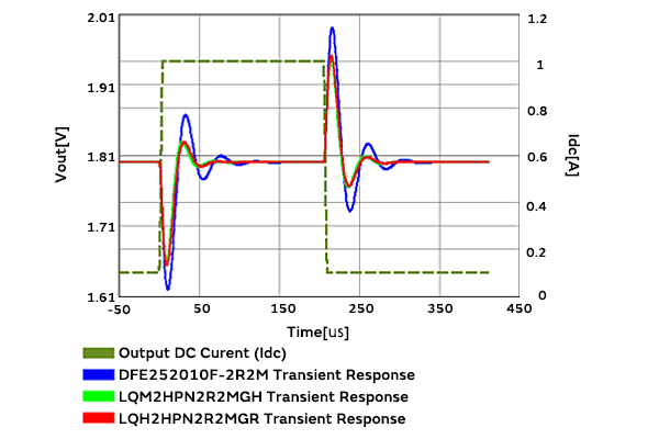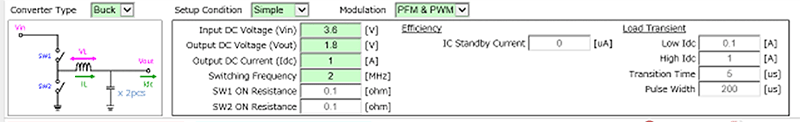 DC-DC转换器动作条件设定表格:显示例)Vin:3.6V,Vout:1.8V,频率:2MHz,Idc Max:2A