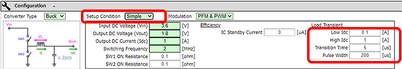 在DC-DC转换器的设定表格中输入本事例的工作条件。
