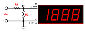 When measuring voltages greater than the full-scale input range of a given meter, or when the desired display reading is something other than the direct value of the dc input voltage (Vin), the input must be first attenuated before it is presented to the meter's IN LO (-) and IN HI (+) input terminals. A simple two-resistor voltage divider, similar to that shown in the figure above, will scale the input voltage down to the range of the selected meter. For most applications, a +/-2V input meter ("-1" model) is preferred because its high-impedance input will not adversely affect the voltage developed across R2.