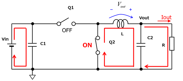 在Q1关断的toff期间,为了维持线圈L上流动的电流,经由Q2向负载释放电流。 此toff期间的纹波电流为: