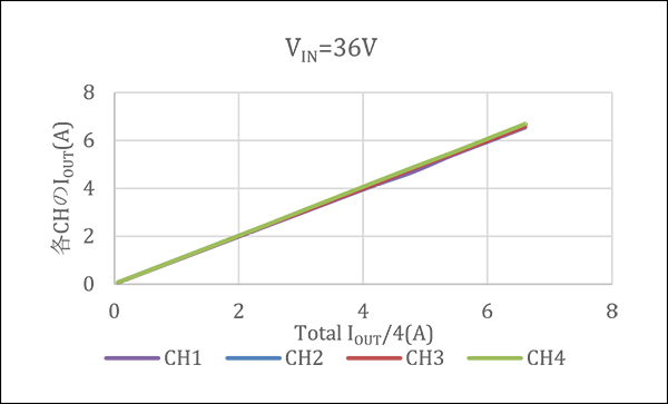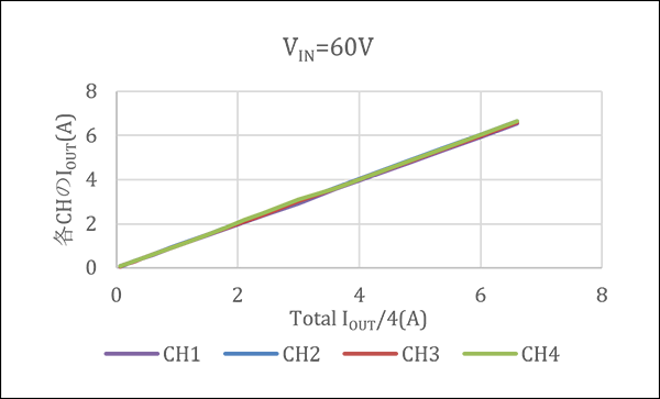 图9表示温度特性。本评估的温度为TA=25degC,在自然空冷的条件下实施了评估。在本次测量中,由于未使用散热器进行散热,中间2台难以散热的模块温度上升。假设从图5的CH1或CH4强制实施空冷,安装在风扇一侧的模块温度将会下降,电流更易流过。由于强制空冷可能导致模块之间的电流共享变差,因此强制空冷时应注意风扇的方向。