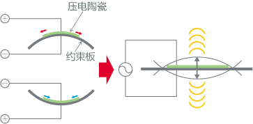 压电陶瓷具有根据电压方向 <= 陶瓷膨胀 => => 陶瓷收缩 <= 的特征。 通过反复膨胀收缩让空气振动并发出超声波。