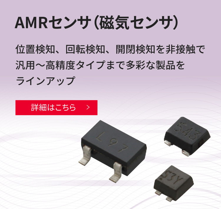 磁界の強さや向きによって抵抗値が変化するAMR素子を利用した磁気スイッチで、磁石との組み合わせにより、回転検知や位置検知を非接触で行えます。 磁気スイッチはシリンダーの位置検出用途、ガス・水道メーターなどの回転検出用途、一眼レフカメラ、ビデオカメラ、冷蔵庫などの開閉検知用途に使用されています。