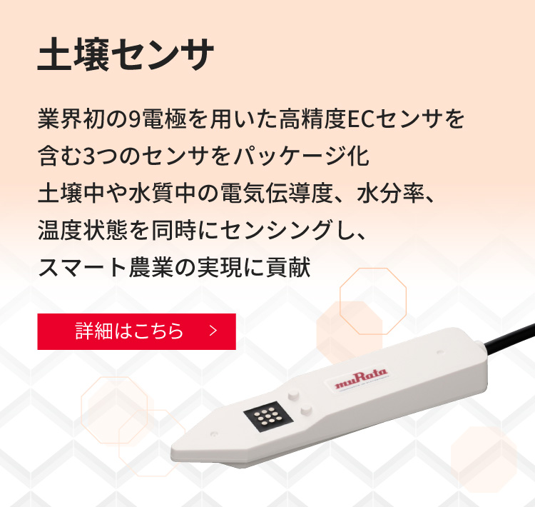 土壌センサとは農業における土壌、水質中の状態を継続的にモニタリングし、可視化するために開発されたセンサです。3つのセンサがひとつのパッケージに内蔵されており、EC(電気伝導度)、Moisture(体積水分率)、Temperature(温度)を土壌中、水中で同時に計測することができます。 特に業界初の9電極を用いたECセンサは多くの測定パターンと独自アルゴリズムにより不確定性の排除に貢献します。