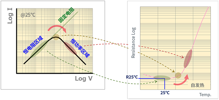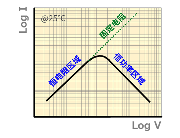 PTC热敏电阻的I-V特性如图1所示。 施加电压使得电阻的内部发热和向外的散热达到平衡状态时,外加电压和稳定自电流之间关系建立。定值电阻区域内、V = IR关系成立,PTC热敏电阻无自发热。PTC热敏电阻还拥有最大电流点和恒功率区域两个参数。