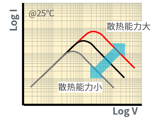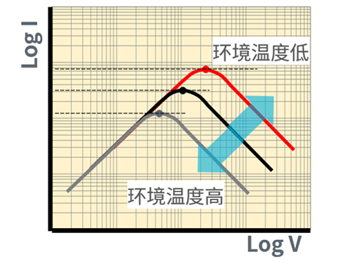 对于固定特性的PTC,其I-V特性会随着环境温度的变化而波动,如图3“环境温度变化”所示。最大电流点是跳闸电流。 从该图中可以确认跳闸电流值因环境温度而异。因此,跳闸电流是在25°C(例如−10°C)以外的额定温度下定义的。