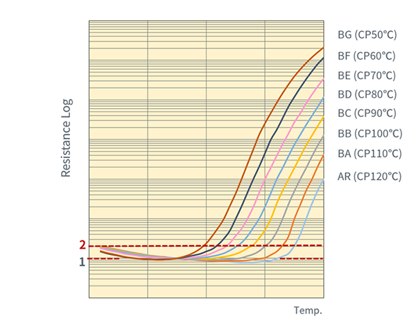图2 : 居里点不同的PTC阻值-温度特性