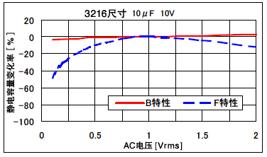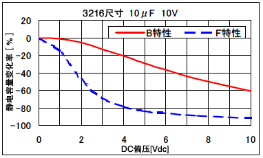 接下来,我们以3216(1206) in mm(inch)尺寸、10µF的B特性和F特性为例,对影响静电容量测量的多种特性进行说明。