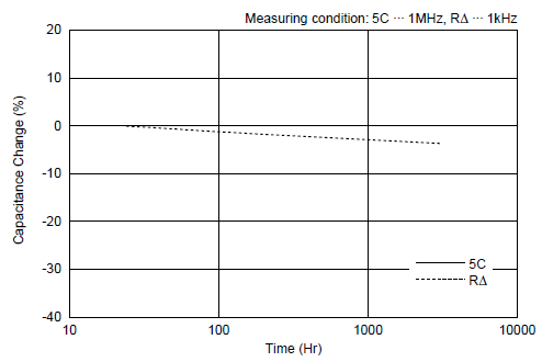 陶瓷电容器中,尤其是高诱电率系列电容器(B/X5R、R/X7R特性),具有静电容量随时间延长而降低的特性。
