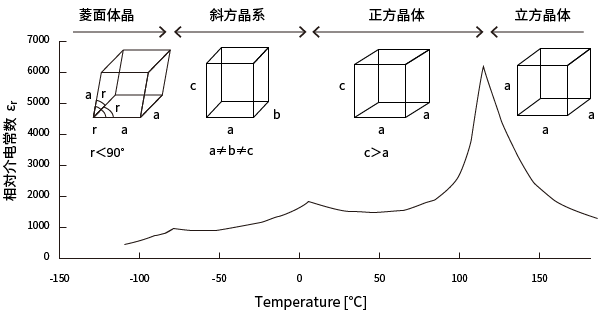 上图是在居里温度(约125℃)以上时的立方体(cubic)的晶体结构,在此温度以下的常温领域,为一个轴(C轴)伸长,其他轴略微缩短的正方晶系(tetragonal)晶体结构。