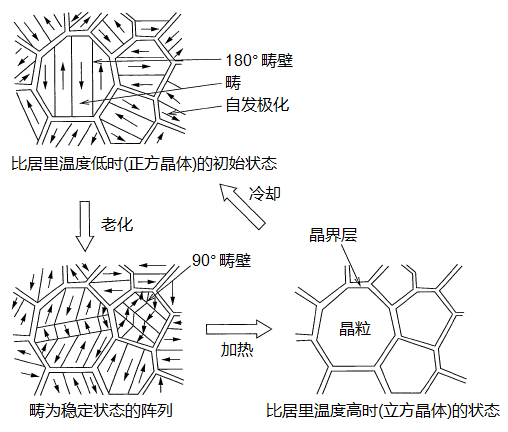 当将其冷却到居里温度以下时,在居里温度附近,从立方晶体向正方晶体发生相转移,并且C轴方向将延长约1%,其他轴将略微缩短,自发极化及畴将生成。同时晶粒将受到因变形而产生的压力。