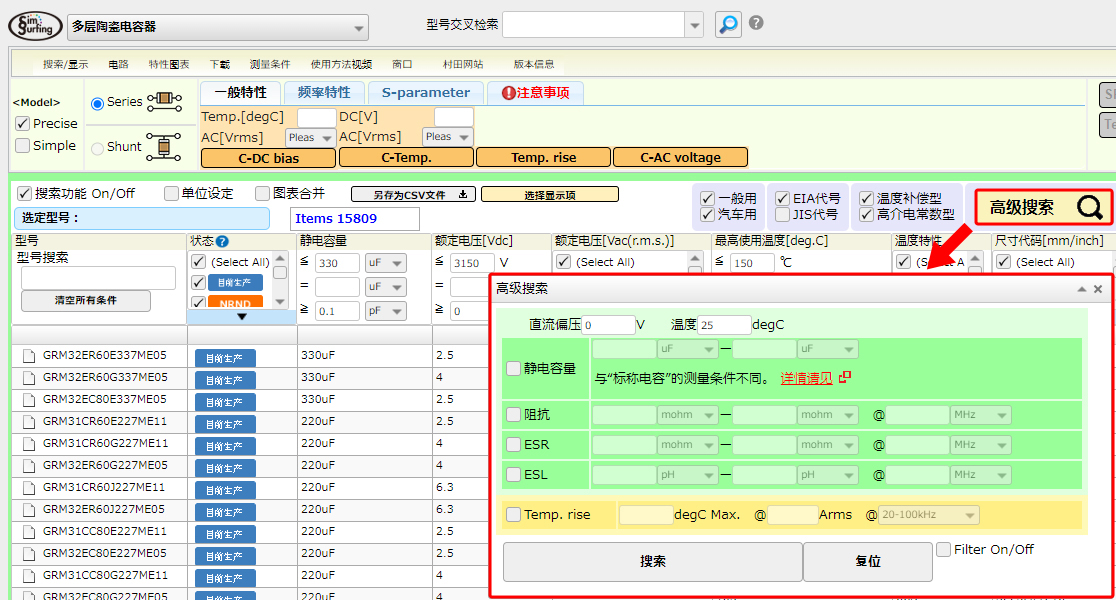 替换电解电容时,请根据电解电容的说明(系列、静电容量、电压等)从本公司的产品阵容中选择同等产品,也可以在确认实际使用的频带内的阻抗后,在SimSurfing的进阶搜索