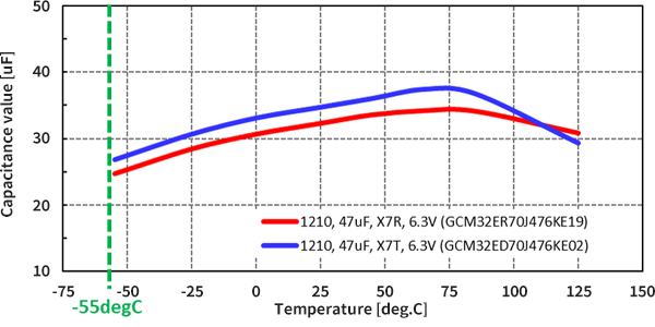 另一方面,在实际使用条件下,在工作温度范围(-55至125℃)内进行比较可以发现,X7R和X7T在低温侧的电容变化率均变大。