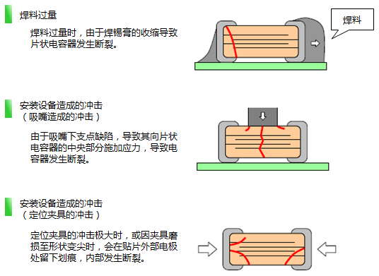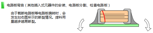 安装于电路板时受到机械/热应力、安装后电路板弯曲等机械应力是造成电容器发生断裂的主要原因。 电路板安装时主要有以下几种机械应力。