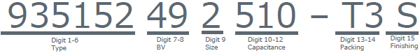 第1-6位表示系列名称,第7-8位表示BDV,第9位表示尺寸,第10-12位表示电容值,第13-14位表示包装形式,第15位表示电极表面材料。