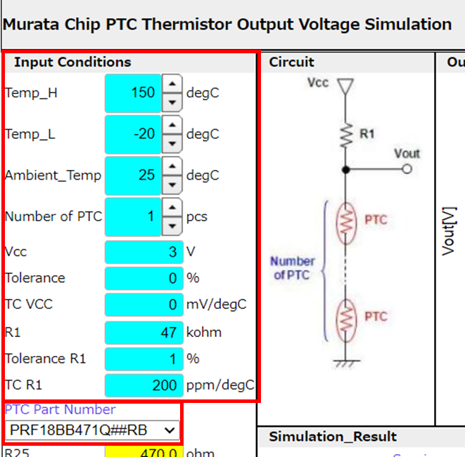 可以针对正温度系数(PTC)热敏电阻和电阻器的接地电路仿真输出电压-温度特性。